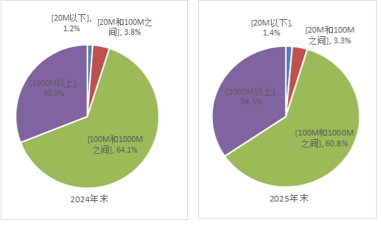 截至2025年底,中國電信、中國移動和中國聯通三家基礎電信企業的固定互聯網寬帶接入用戶總數達6.91億戶,全年凈增2099萬戶。其中,100Mbps及以上接入速率的用戶為6.59億戶,全年凈增2299萬戶,占總用戶數的95.3%,占比較上年末提高0.4個百分點;1000Mbps及以上接入速率的用戶為2.38億戶,全年凈增3157萬戶,占總用戶數的34.5%,占比較上年末提高3.6個百分點。截至2025年底,光纖到房間(FTTR)用戶達5939萬戶。