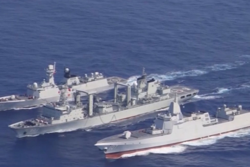總臺軍事觀察員 魏東旭:演訓(xùn)畫面顯示,107編隊包括一艘055型驅(qū)逐艦、一艘052D型驅(qū)逐艦、一艘054A型護衛(wèi)艦和一艘綜合補給艦。這是一種典型的火力加強型的驅(qū)護艦編隊。在編隊當(dāng)中,055型驅(qū)逐艦和052D型驅(qū)逐艦?zāi)軌蚶米陨硐冗M的相控陣?yán)走_和遠程的防空作戰(zhàn)體系,為編隊撐起嚴(yán)密的防空反導(dǎo)保護傘。
