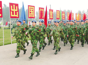 “走出國門,傳承文明友誼;維護和平,共建和諧世界!”一隊頭戴藍色貝雷帽、身穿迷彩服、胳膊上佩戴著“地球和橄欖枝”臂章的士兵踏著整齊的步點,喊著鏗鏘有力的號子,出現在筆者面前。