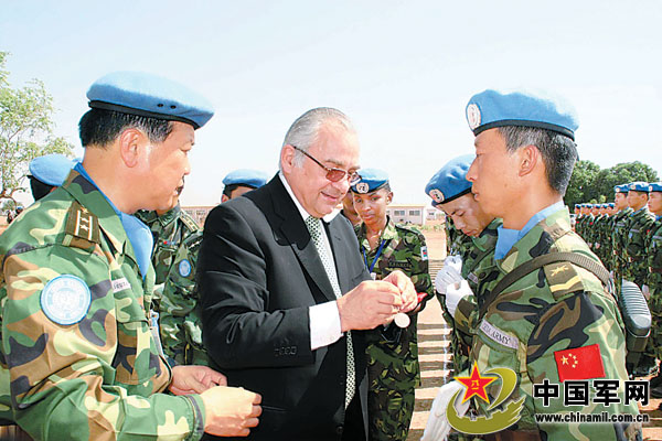 “為親眼目睹這支‘聯蘇團六個戰區中最優秀的隊伍’,我一定要在中國最隆重的節日,親手為你們授勛!”卡齊先生是去年9月出任現職的,雖然從未到中國維和部隊營區視察過,但對中國維和部隊表現出的專業素質和敬業精神早有耳聞。在熱情洋溢的致辭后,卡齊一句生硬的漢語“拜年了”引來官兵熱烈的掌聲。