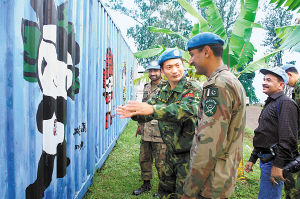 為了宣傳奧運,維和官兵在營院里面制作了各種各樣的奧運標志。充作庫房的集裝箱上噴繪的是福娃的形象,草坪中的一片空地上,則是官兵們用簡易器材做成的五環圖案和“Beijing2008”字樣。作戰組參謀張寶軍向前來參觀的外國友人一一作著介紹,還特別介紹了奧運會會徽標志代表的里程碑、承諾、形象、美麗、英雄、精神、邀請等七層含義。當地教育協會的阿里特邊聽邊記,還將中國印和五個福娃的形狀畫了下來。聯剛團志愿者部門的卡爾松則連聲說,要調整假期到北京去看奧運會比賽……