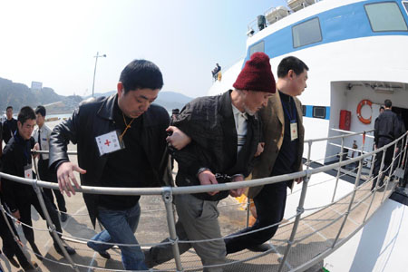 接下來的一切,是雙向遣返任務中的“常規動作”:確認王志華身份無誤后,臺灣執法人員把他移交給大陸有關人員。頭戴帽子、胡子花白的王志華卸下了臺灣的手銬腳鐐,換上了大陸的手銬,在一前一后兩個佩戴紅十字會證件的工作人員押帶下登上扶梯進入“海峽”號。