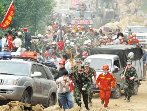 5月17日下午3時40分,記者再次來到北川,剛剛走到救援部隊的大本營——任家坪時,就發現大量的災民和救援人員往外涌,行進的車輛和腳步匆匆的人群使路面揚起了陣陣灰塵。重慶消防支隊一位戰士告訴我們,因為北川后側山頂的水壩可能決堤,1個小時前已經發出信號彈,要求救援人員和災民撤離北川縣城。