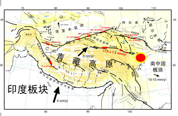印度板塊向亞洲板塊俯沖,造成青藏高原快速隆升。高原物質(zhì)向東緩慢流動(dòng),在高原東緣沿龍門(mén)山構(gòu)造帶向東擠壓,遇到四川盆地之下剛性地塊的頑強(qiáng)阻擋,造成構(gòu)造應(yīng)力能量的長(zhǎng)期積累,最終在龍門(mén)山北川-映秀地區(qū)突然釋放。