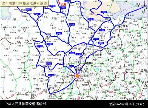 戴東昌介紹,到目前為止,通往重災(zāi)區(qū)的三條生命線,作為公路運(yùn)輸?shù)闹魍ǖ酪呀?jīng)打通。第一條搶通的是通往汶川的大通道,它是在5月15號(hào)晚上9點(diǎn)半打通。之后,相繼在5月17號(hào)打通了從甘肅往南到茂縣的北線,以及從成都經(jīng)過(guò)都江堰到映秀的南線。應(yīng)該說(shuō)南線這條線最艱難,災(zāi)情最嚴(yán)重,在搶通過(guò)程中遇到困難也是最大的。這三條生命線在維護(hù)人員的全力維護(hù)下能夠保持暢通。