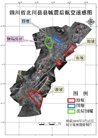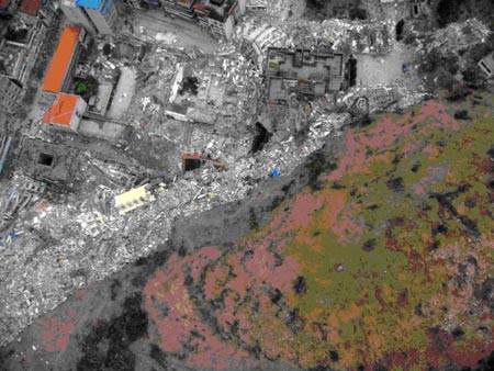 四川汶川8.0級強烈地震發生后,民政部國家減災中心組建技術工作組趕赴四川地震災區開展災情評估工作。5月15日上午,工作組利用小型無人駕駛飛機在重災縣北川進行了航拍,共獲取北川縣城南部地區高清晰航拍照片與視頻影像。并與首都師范大學合作對數據進行判讀。