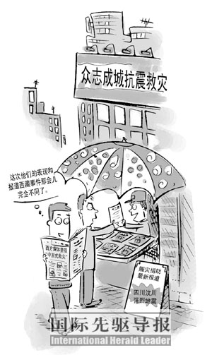 國際先驅導報文章 中國發生“5·12”汶川大地震之后,西方媒體給予了大量積極正面的報道。一直以來認為“中國媒體不可信”的西方媒體,比如CNN、BBC等,在此次地震報道中都大量使用了中國媒體的電視畫面和文字報道,這十分少見。與之前報道西藏“3·14事件”、“奧運圣火傳遞”相比,西方媒體報道的態度來了個180度的大轉彎。即使有少量負面報道和批評聲音,但這些已經讓西方讀者覺得不那么可信了。西方民眾、媒體評論人,總體上都正面評價中國政府組織的抗震救災,以及贊揚中國人民在災難面前表現出來的勇氣。