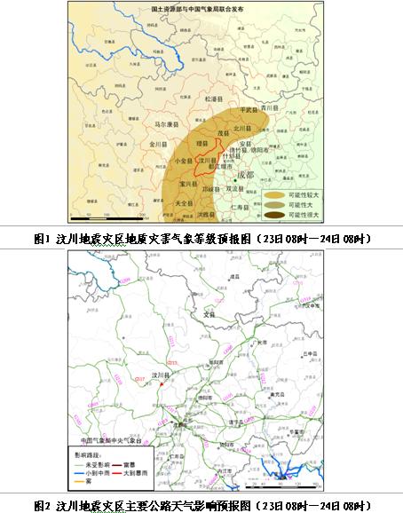 23日-24日以及27日,四川、甘肅南部、陜西南部等地震災區以多云間晴天氣為主,云量3-7成,云底高度一般為1500-3000米;能見度一般為10-30公里,較有利于開展抗震救災工作;但災區白天氣溫較高,最高氣溫將可達26-31℃,帳篷內的溫度較氣溫高4-5℃,需注意通風透氣,采取防暑措施。另外建議加強對環境以及污染水源的消毒工作,防止災后疫情的發生。