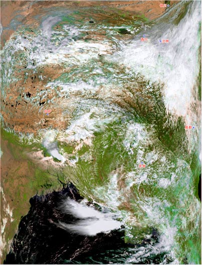 從北京、廣州、烏魯木齊、佳木斯4個氣象衛星地面站接收到風云三號A星第一軌可見光圖像中可以明顯看到,云圖右側的西北地區東部、西南地區東部以及青藏高原東北部受過境鋒面系統影響,被白亮的云系覆蓋;云系南側,包括四川地震災區在內的盆地地區為層狀云覆蓋;云圖左側青藏高原其他地區上空云量較少,地表清楚,青海湖、哈拉湖、納木錯、色林錯等水體清晰可辨。