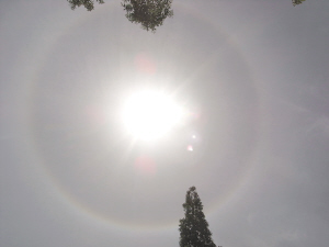 又訊 “不會又有事情發生吧?”、“不會,這是一個好兆頭!”昨日中午11時38分,記者到達青川縣城時,許多市民正仰天觀望,議論紛紛。有的市民稱,他們這輩子還是第一次見到這么大的日暈。記者抬頭發現,在上空出現了一個巨大圓形,圍繞著太陽,最里面是一片灰色,外面依次是紅色、淺綠色和白色,這一現象持續了一個多小時才消失。