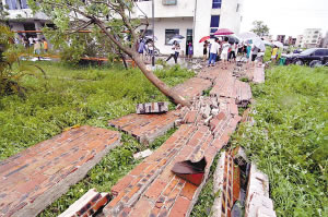 走進受害最嚴重的低垌行政村寧屋小學看到,學校門前的10多畝香蕉,在龍卷風過后,已被攔腰截斷。走入學校,更是一片狼藉。兩排的大王椰被截斷,圍墻倒塌。教學樓門前用鐵皮造成的宣傳欄被席卷一空。學校前、后面的幾棵大樹也被連根拔起;10輛摩托車倒臥在教學樓一樓樓梯口并被疊成了一堆;樓高三層的教學樓受損尤為嚴重:樓梯、走廊、課室到處遍布玻璃碎片,踏一步都要小心翼翼;每個教室里的桌椅,都無一例外地被龍卷風吹得橫七豎八,“擠”成了一團;教師的宿舍也“體無完膚”,破爛的玻璃遍布一地,放在室內的煤氣瓶也被吹倒……