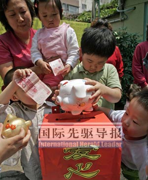 5月15日,天津和平區(qū)保育院的兒童帶著自己的存錢(qián)罐,向四川地震災(zāi)區(qū)捐獻(xiàn)自己的“積蓄”。劉海峰/攝