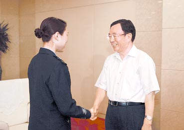 圖為賀國強與“抗震救災優秀紀檢監察干部”蔣敏親切握手。(李玉龍 攝)