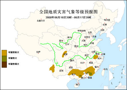 中新網6月16日電 中國氣象臺消息,國土資源部、中國氣象局16日下午5時聯合發布地質災害氣象預報: