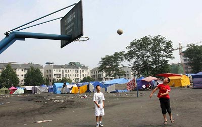 6月17日,兩名都江堰兒童在一排救災帳篷前打籃球。記者高劍平攝
