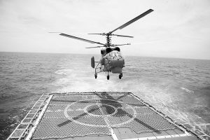 獵鷹嘯海空,潛艦穿碧海。驅護艦編隊、潛艇、反潛直升機在盛夏的海面上攪起陣陣練兵熱潮。從早上6時到下午4時半,直升機攻擊、單艦與直升機協同反潛、編隊與直升機協同反潛等課目輪番上陣,實現了偵察監視、信息傳輸、精確打擊一體化的聯合反潛行動。 (孫陽 汪魯迅 王朝武)
