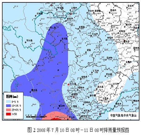 10~11日:地震災區以陰天間多云天氣為主,有陣雨或雷陣雨,雨量小到中雨,局部地區有大雨(圖2);氣溫將下降2-5℃。