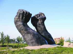 陳雙全任市長期間,銅川市內的“雙拳”雕像。本報記者 楊繼斌 攝