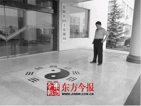 昨天下午,記者在河南宜陽縣國土資源局采訪時發現,該局辦公大樓出口處的地板上鑲嵌有一幅碩大的黑色瓷磚八卦圖,該圖不但在整個平臺的正中央,而且恰好還處在辦公樓內大廳的中軸線上。