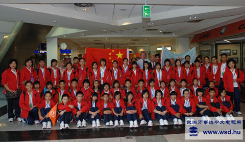 記者在機場暫短的時間里采訪到災區青少年代表團領隊、教育部參贊孫玲女士,她介紹了這次來匈的災區孩子情況,他們都是成都地區下屬受災最嚴重三個市中的都江堰市與彭州市的孩子,地震孤兒是父母雙亡,沒有親屬收養的孩子,這些孩子已先到俄羅斯療養,我們這個團的孩子是失去親人,親屬受傷或死亡成為單親家庭的孩子,是受災地區較重的孩子,他們在地震中表現的非常勇敢、頑強,他們家中的住房在地震中震垮了,所有孩子的學校在地震中倒塌了,他們住在臨時住房中,也在臨時房子中上學。孩子年齡最小的13歲最大的16歲,所有孩子都會說四川話,記者也是半個四川人,記者用四川話向孩子們問好!所有孩子用四川話回答,現場氣氛非常融洽,一下拉近了與孩子的距離。