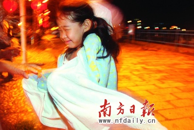 海陵島上的小游客在狂風中艱難行走。本報記者朱丹陽梁文祥攝