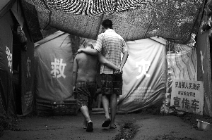 劉軍是北川縣曲山鎮(zhèn)人,地震奪去了他妻子的生命,家財(cái)盡毀。現(xiàn)在劉軍已出院,在北川擂鼓鎮(zhèn)的災(zāi)民安置點(diǎn)四處游蕩。周?chē)臑?zāi)民說(shuō),他時(shí)常沉默不語(yǔ),四處扒土。