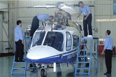 機(jī)務(wù)人員在對一架直升機(jī)進(jìn)行保養(yǎng)檢查工作。本報記者 董世彪 攝