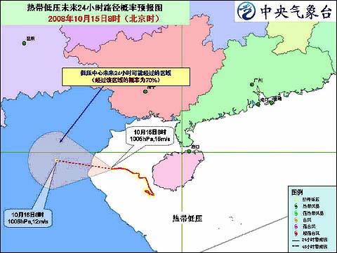 中央氣象臺(tái)2008年10月15日10時(shí)發(fā)布熱帶低壓消息:目前在北部灣海面活動(dòng)的熱帶低壓的中心今天上午8時(shí)位于越南清化省清化市東南方大約125公里的海面上,就是北緯19.2度、東經(jīng)106.8度,中心附近最大風(fēng)力有7級(jí)(16米/秒)。