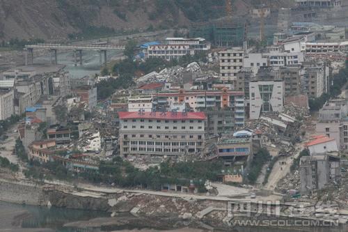 山谷中,青山綠水間的北川縣城盡收眼底,藍色、橙色、紅色的屋頂錯落有致;湔江上,連接新老縣城的吊橋清晰可見;老縣城里,北川電力公司藍紫色的框架格外惹眼;新縣城里,毛壩中學操場上的國旗迎風飄揚。站在這里,可以看到菜市里熙熙攘攘的人群;可以看到三輪車夫在路上攬客……地震發生后,難以計數的巨石將三倒拐壓得嚴嚴實實,所有的樓房無一例外遭到巨大破壞。