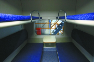 每節(jié)車廂被分割成10個(gè)獨(dú)立包廂,寬敞的包廂里上下鋪共有4張床位,每個(gè)床腳都有獨(dú)立電視,包廂門(mén)口還加裝了呼叫系統(tǒng)。將于本月21日首發(fā)的京滬、京杭臥鋪動(dòng)車組,增加了大量人性化設(shè)計(jì)。昨日,本報(bào)記者提前上車探訪了這趟國(guó)內(nèi)最高級(jí)的臥鋪車。