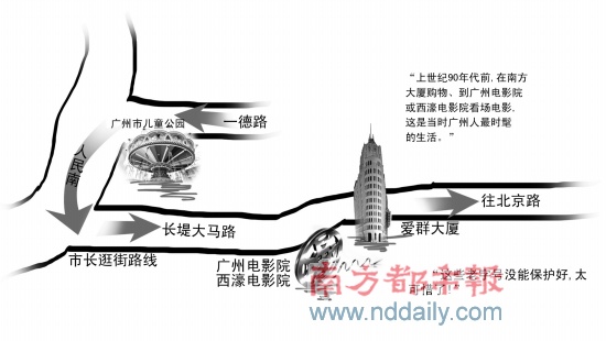 離開兒童公園,張廣寧沿人民南路向南走去。當看到廣州電影院和西濠電影院的招牌時,張廣寧還回憶說,上世紀90年代前,在南方大廈購物、到廣州電影院或西濠電影院看場電影,這是當時廣州人最時髦的生活。眼前,廣州電影院已變成一家KTV,而西濠電影院則變成了一家網吧。見此情此景張廣寧立即要求致電主管部門,了解這幾家老字號的產權及消失原因。