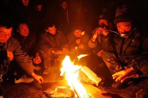 天氣寒冷,夜晚工人們圍簇在篝火邊取暖。