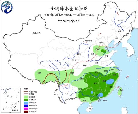 23日08時至24日08時,西藏中東部、川西高原大部等地有小雪(雨)或雨夾雪等地有小到中雪(雨)或雨夾雪,降水量約為1~3毫米;陜西南部、西北地區東部偏北地區、江漢、華北中東部、黃淮西南部、江淮西部、江南、華南等地有小雨或陣雨,其中江漢南部、江南大部、華南大部等地的部分地區有中雨,廣西東北部、廣東北部、江南東南部等地的局部地區有大雨,降水量約25~38毫米;上述部分地區還將伴有短時雷雨大風等強對流天氣。內蒙古中西部、東北東部、華北北部等地有4~6級偏北風;新疆南疆盆地的部分地區有揚沙或浮塵天氣。渤海將有4~5級東南風轉6~7級東北風,黃海北部海域將有4~6級西北風,黃海中部和南部海域將有4~6級東北轉偏東風,東海大部海域、臺灣海峽、臺灣以東洋面和以南海域將有5~6級東北風。