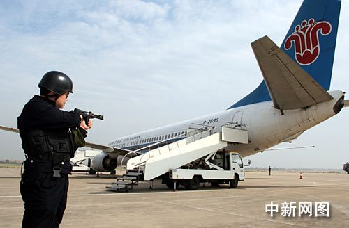此次演練設計的緊急狀況,是某航空公司的2222航班正飛越武漢上空時,突然有兩名不明身份的歹徒用刀脅制四名旅客,并向飛機駕駛室逼近,企圖劫持飛機。