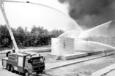 15時15分,就在圍剿接近尾聲時,現場突然出現意外,一名殘余“恐怖分子”引燃身上所攜帶炸藥,將廠區內兩個化工原料儲存罐炸毀,造成大量有毒化學氣體泄漏。廠區內頓時濃煙滾滾,火光沖天。面對緊急情況,消防力量馬上出擊,展開滅火、化學品罐堵漏、毒氣源稀釋等工作。同時環保、氣象和衛生力量也馬上進行空氣監測、中毒人員緊急救治等工作。大約半小時后,人質和中毒人員全部得到緊急救治,廠區周圍有毒氣體濃度也降到安全值以內,周邊地區和首都北京的安全得到了保障。演習結束。