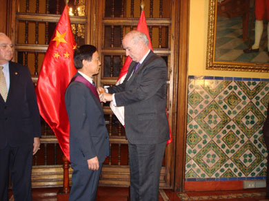中新網6月23日電 據中國外交部網站消息,6月22日,秘魯外長加西亞向即將離任的中國駐秘魯大使高正月授予秘魯太陽大十字級勛章。我館政務參贊虞越、秘第一副總統詹彼得里、外貿旅游部長阿勞斯、部分政界高官、國會議員、駐秘使團代表、企業界等各界友好人士等50多人出席。