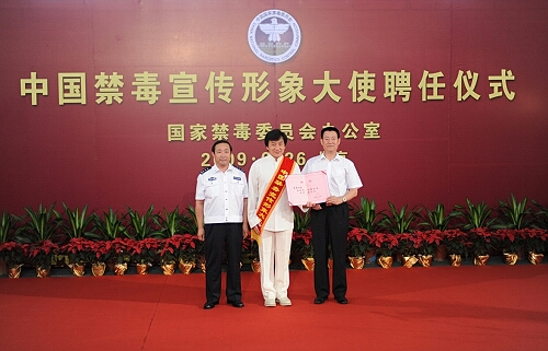 國家禁毒委員會辦公室常務副主任、公安部禁毒局局長楊鳳瑞為中國禁毒宣傳形象大使成龍頒發聘書并佩戴綬帶。