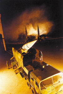 動真格的了!馬小江掏出指北針,指揮部隊開進。當他帶領部隊到達陣地時,距規定時間只剩下幾分鐘。這一路,他們途經3個塌方險要地段,遭遇一次空襲警報,兩次躲避偵察衛星臨空……他們的代價是:1輛發射車在躲避衛星偵察時因偽裝不善被“敵”發現,被判“摧毀”。