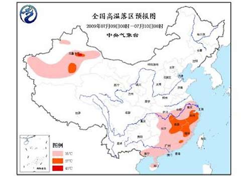 中新網7月9日電 中央氣象臺今日06時繼續發布高溫預報:預計,今天白天,新疆北疆南部和南疆盆地、湖北東部和南部、江淮南部、江南大部、華南中東部等地有35 ℃以上的高溫。