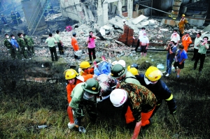 救援人員運送傷員。15日凌晨2時左右,河南省偃師市顧縣鎮,河南洛染股份有限公司發生劇烈爆炸事故,“約有10噸氯苯發生了爆炸”,已造成7人死亡,108名被震碎的玻璃劃傷的周邊群眾仍在醫院接受治療。