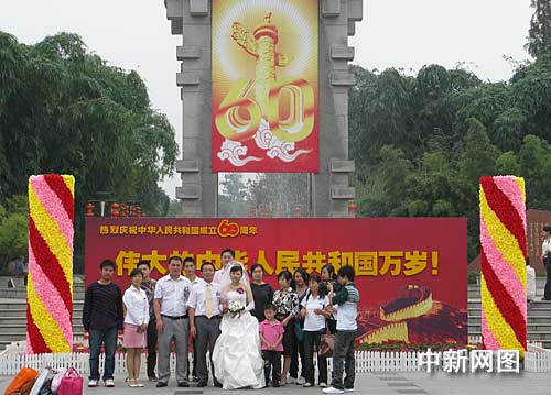中新網(wǎng)成都10月1日電 (劉賢) 今日上午,成都浣花溪公園迎來(lái)了多對(duì)新人。他們有的身穿婚紗西服,有的則穿著傳統(tǒng)的紅色唐裝旗袍,紛紛在公園門(mén)前的“偉大的中華人民共和國(guó)”海報(bào)合影。這些新人表示,他們選擇在今天拍照,是因?yàn)榘炎鎳?guó)六十歲生日與結(jié)婚紀(jì)念日合為一天更有紀(jì)念意義。(完)