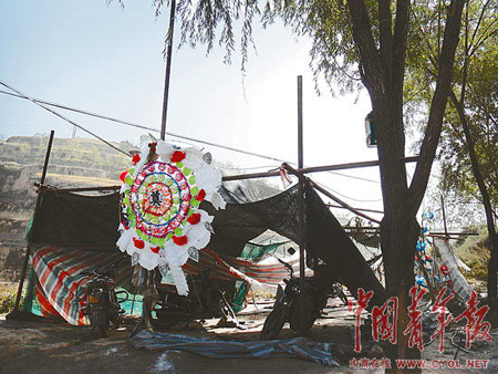 10月20日上午11時許,山西省呂梁市臨縣林家坪鎮白家峁村。村口不遠靠近公路的空地上,有幾個用棚布搭起的簡易帳篷,有的被燒得只剩下幾塊破布,在秋風中無力地搖曳著。這是幾個月前村民為護礦搭起來的,現在成了村民郝兔照的靈堂。他的棺材已經在這里放了8天,旁邊擺放著花圈、供品。