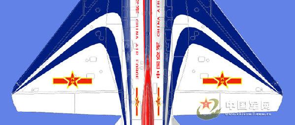 殲-10表演機的機徽與空軍軍機機徽相同,為軍徽兩邊襯一鑲有對稱的金黃色等邊的紅帶,中間嵌金黃色“八一”二字,“八一”為宋體漢字。噴涂在機身后部左右兩側、左右機翼上表面,共4處(見圖7、8、9)