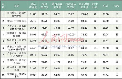 傳統媒體關注度由100多家中央級媒體、市場化媒體、廣播電視媒體等三類媒體的報道數量做加權處理后統計所得;網站推薦由主要新聞網站的網站報道評論數、專題數、在線調查數、嘉賓訪談次數等4項數據做加權處理后統計所得;網民關注度由網民在主要網絡社區/BBS、博客上的發表(發帖)量、瀏覽量數據做加權處理后統計所得;意見領袖關注度由400余位“意見領袖”的博文、BBS帖文和在學術文化類網站發表的言論三項數據做加權處理后統計所得;境外媒體關注度依據對路透社、BBC、美聯社、紐約時報、泰晤士報、星島日報、聯合早報、FT中文網、鳳凰網等25家境外媒體的報道數量統計、處理后所得;網下行動依據各事件所引發的網下行動的規模、激烈程度進行評估后所得,分為紅、橙、黃、藍四個級別,熱度相應由高至低。