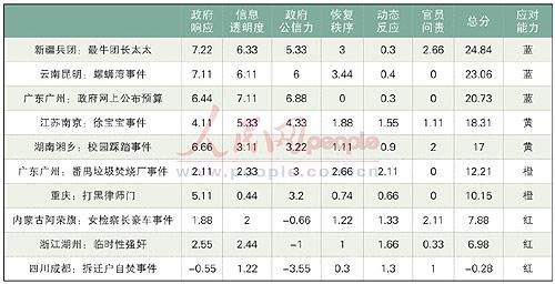 人民網輿情監測室從100多家境內外報刊的新聞報道和評論,8家門戶網站的新聞跟帖,約30家論壇/BBS,400余名網絡“意見領袖”博客,以及微博客、QQ群和播客網站中,梳理出了2009年第四季度十件“輿情熱點事件”,并按照“政府響應、信息透明度、政府公信力”3個常規指標,以及“恢復秩序、動態反應、官員問責”3個特殊指標,對2009年第四季度十件“輿情熱點事件”的政府應對、處置能力做出了評估,結論是: