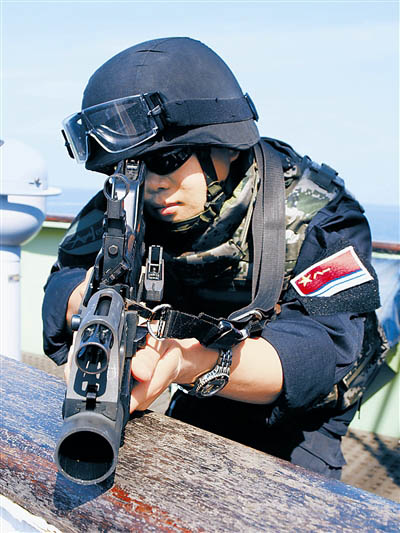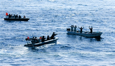 12時28分,巢湖艦在艦載直升機的引導下鎖定了正在轉向“鴻達號”商船的疑似海盜快艇。在發射3枚信號彈予以警告后,疑似海盜快艇被迫停車,隨后趕到的馬鞍山艦迅速派出2艘小艇靠近,特戰隊員將其驅離。