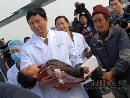 下午5時10分,空運到成都的首名傷員被抬上第一輛救護車,傷員的口、鼻、眼睛布滿了血痂,手腕、手臂上全是傷痕。抬上擔架后,隨車主治醫生余海放立即對其測量血壓、心率,詢問有何不適,并進行了登記。傷員的右手腕上拴著紅布繩,這是地震災區醫生經過初診后認定是重傷員的標記。