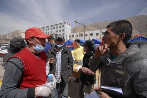 他的名字叫高樹友。在現場負責招募志愿者的玉樹團州委干事扎西告訴我,地震發生后幾小時,滿身是土的高樹友跑來了,找到我們要求當志愿者。“當時現場還很亂,我們隨便找了一張紙,高樹友寫下了第一個名字”,扎西從桌上拿出一個寫滿名字的紙說:“就是這樣的紙,現在已經寫滿幾十頁,有400多人報名了,地震當天有30多個。高樹友不僅是第一個報名,而且幫助我們組織志愿者,這個招募點就是我們一起搭起來的。”