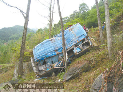 東蘭訊 4月22日上午9時(shí)許,一輛由大化瑤族自治縣七百弄鄉(xiāng)開(kāi)往河池市的客運(yùn)中巴車(chē),在途經(jīng)東蘭縣花香鄉(xiāng)干來(lái)村時(shí)突發(fā)機(jī)械故障,導(dǎo)致車(chē)輛滾下90米長(zhǎng)陡坡(垂直高度40米)。事故造成車(chē)上7名乘客先后死亡,35人不同程度受傷。