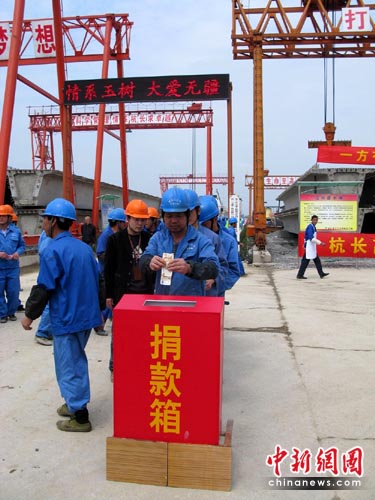 據(jù)杭州市高速公路管理局局長趙益民介紹,青海玉樹地震災(zāi)情發(fā)生后,杭長高速公路杭州段的建設(shè)者們,迅速自發(fā)地開展捐款活動(dòng)。據(jù)悉,昨天,杭長高速共有10個(gè)施工現(xiàn)場舉行了“心系玉樹獻(xiàn)愛心”的捐款活動(dòng),近千名民工參加。